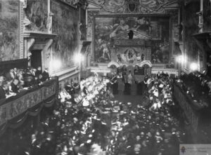On March 7th, Archbishop Dougherty was made a Cardinal by Pope Benedict XV and given the symbols of the Cardinal rank: a scarlet zucchetto, a scarlet biretta (four-cornered hat), and a ring. This occurred alongside the elevations of Archbishops Michael von Faulhaber of Munich and Charles Joseph Schulte of Cologne. Immediately after the public consistory was a secret consistory held in the Sala del Consistoro. Unlike the public consistory that is open to family and those traveling with the Cardinal-elects, the secret consistory is only attended by the College of Cardinals. The March 12 issue of the Catholic Standard and Times talked about this meeting: