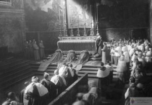 The new Cardinals prostrate themselves before the altar in the Sistine Chapel. Cardinal Dougherty is in the middle between Cardinals von Faulhaber and Schulte.