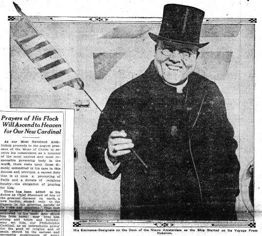 Four hundred clergymen and laymen of Philadelphia accompanied Archbishop Dougherty to New York… Seven special cars were required to bring the big delegation to Hoboken… Thousands of men and women who awaited his arrival at the pier knelt as he passed through their midst to the vessel and when he reached the decks hundreds of others greeted him and filed up to congratulate him and kiss the episcopal ring… When the visitors had gone ashore, Archbishop Dougherty stood on the starboard side of the liner amidships… Just before the liner pulled cut, at a given signal, came the parting salute of flowers. The red carnations worn by the Philadelphia party, roses, violets and orchids were thrown in the air and showered down on the smiling prelate as the Nieuw Amsterdam moved out into the river.