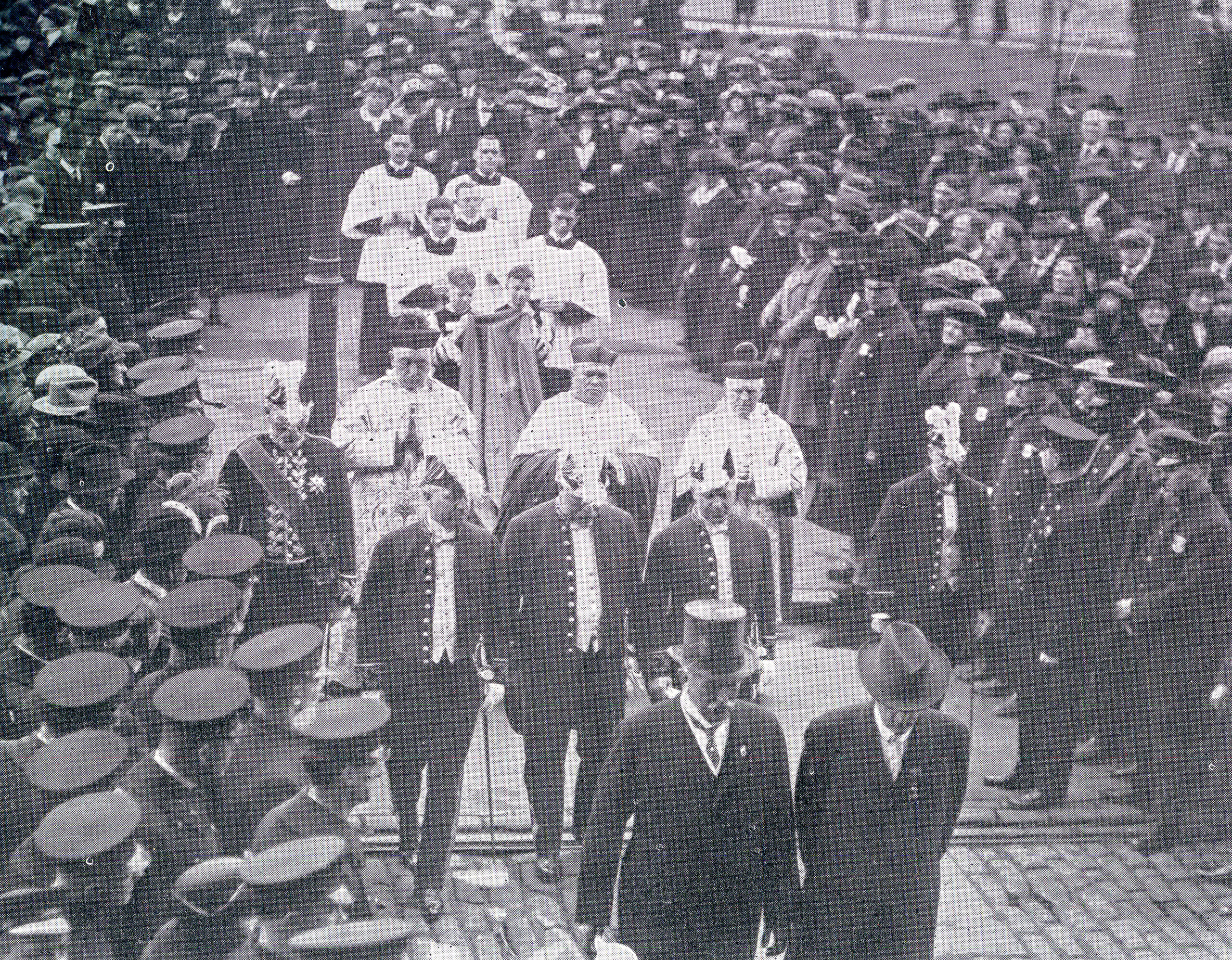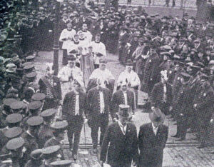 Broad Street from Logan to extreme South Philadelphia was an avenue of light and color and vibrant with an enthusiasm, the like of which the city had never seen before. Tens of thousands of American flags were held aloft in tireless hands or flung from churches, schools, business houses and private homes. Church bells tolled in the steeples of Catholic and non-Catholic churches alike. Hymns of thanksgiving intermingled with deafening cheers, while hundreds of bands poured forth stirring strains of the "Te Deum" and other hymns. Every parish in the city and surrounding suburbs participated fa the demonstration, many of them with thousands in line, marching from their respective churches to the positions assigned along Broad Street.