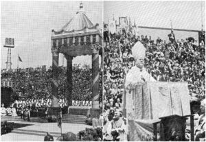 The second event was the Solemn Pontifical Mass. Presided over by Cardinal Dennis Dougherty, the Mass drew an estimated 300,000 Catholics, making it one of the largest religious gatherings in the city’s history at the time. To accommodate the amount of people who could not fit inside, additional altars were set up outside the stadium. The ceremony featured an altar modeled after that of Saint Peter’s Basilica in Rome and “stressed the contribution of the Church to the liberation of man and in particular the contribution of Catholics to the freedom and prosperity of the United States.” [2] With these two events, September and October the most attended months of the Exposition.