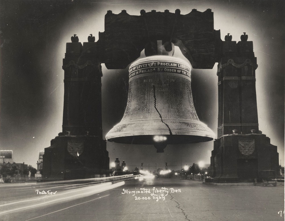 The Liberty Bell archway at night, looking north on Broad Street. https://libwww.freelibrary.org/digital/item/50710